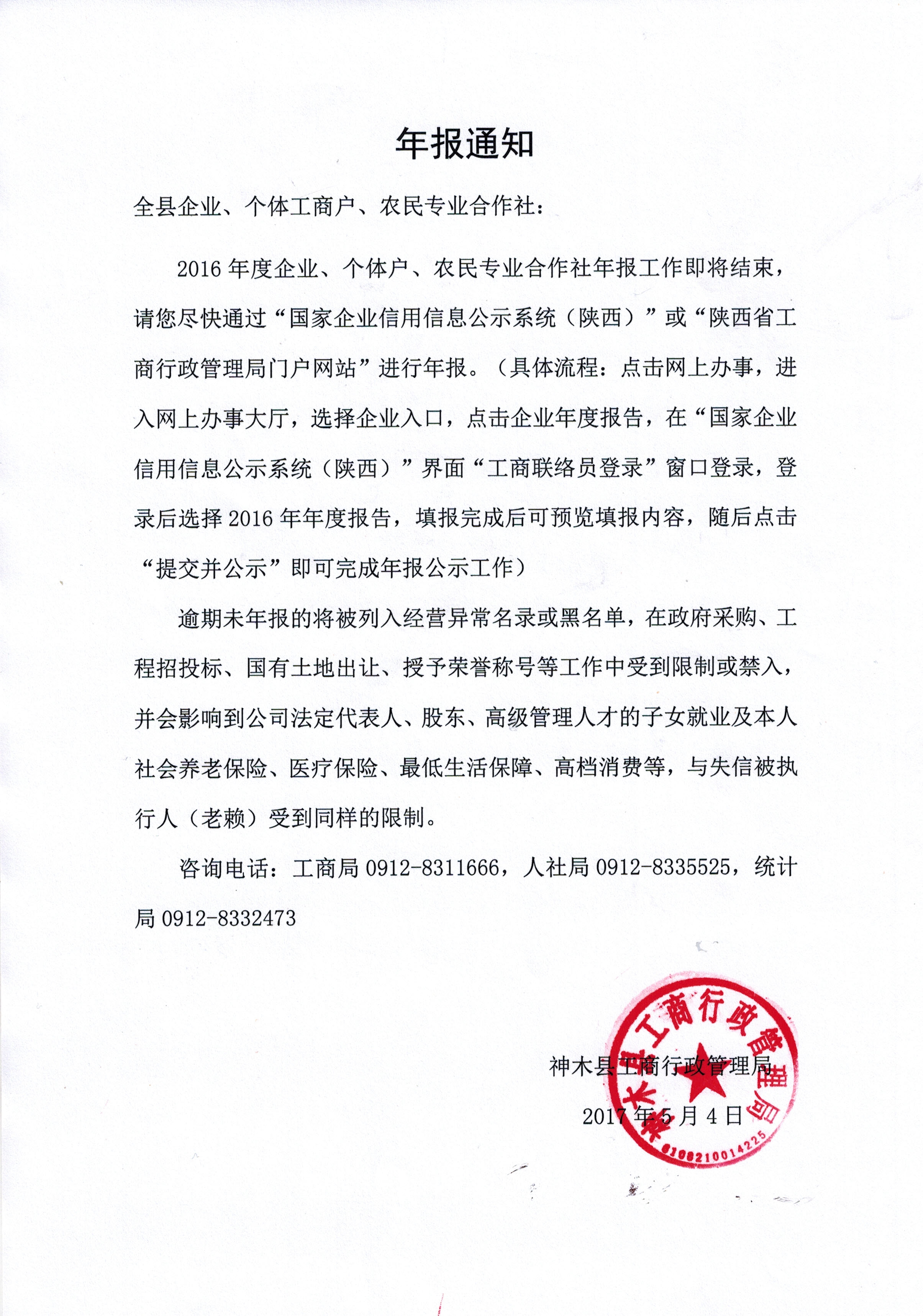 神木县工商局提示年报即将结束